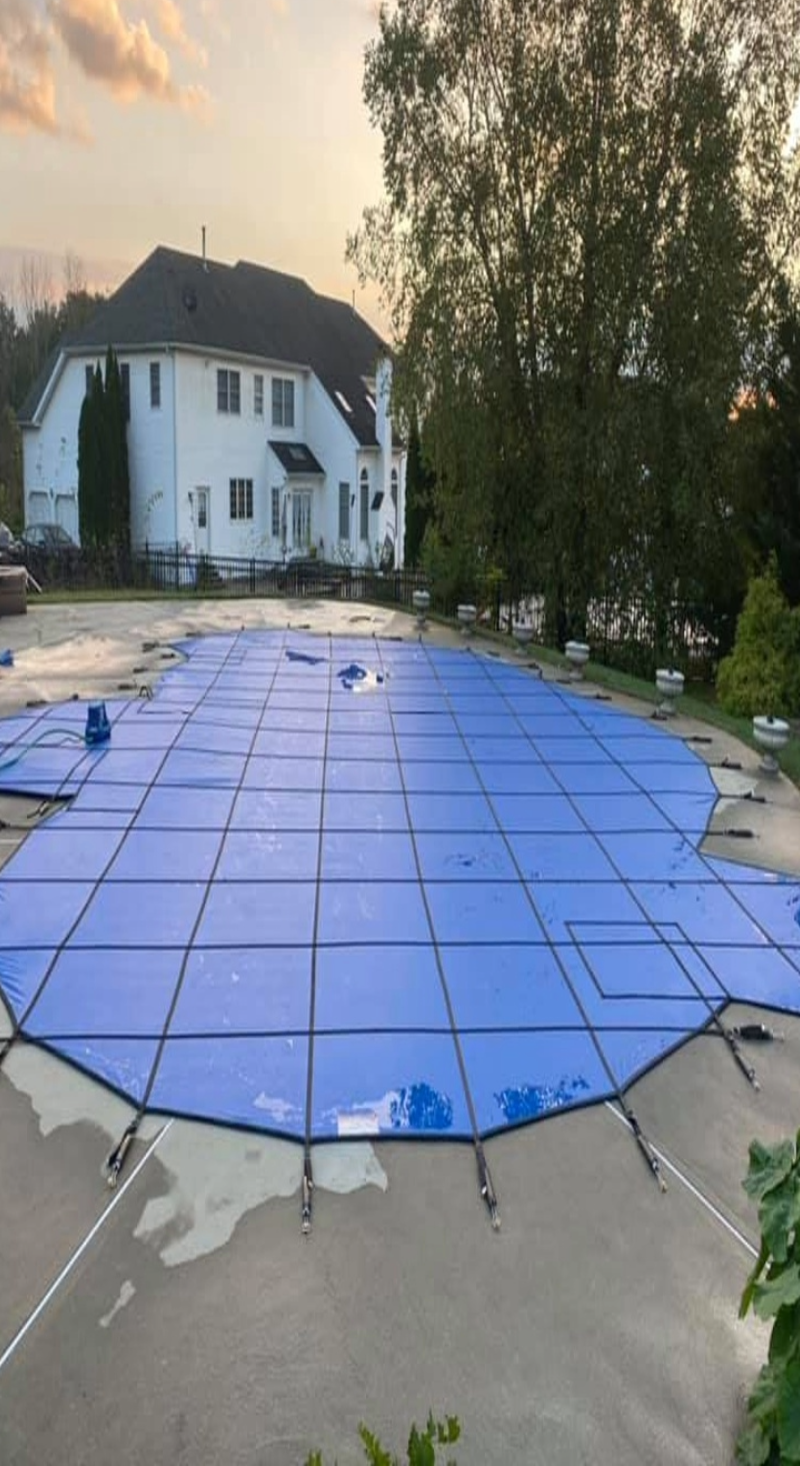 Our safety cover service includes a full inspection and measurements.. During installation, we carefully measure and tension the cover for maximum strength and protection. When removing your cover in the spring, we clean, fold, and store it properly to extend its lifespan. You can expect a safe, efficient process and peace of mind knowing your pool is professionally protected.